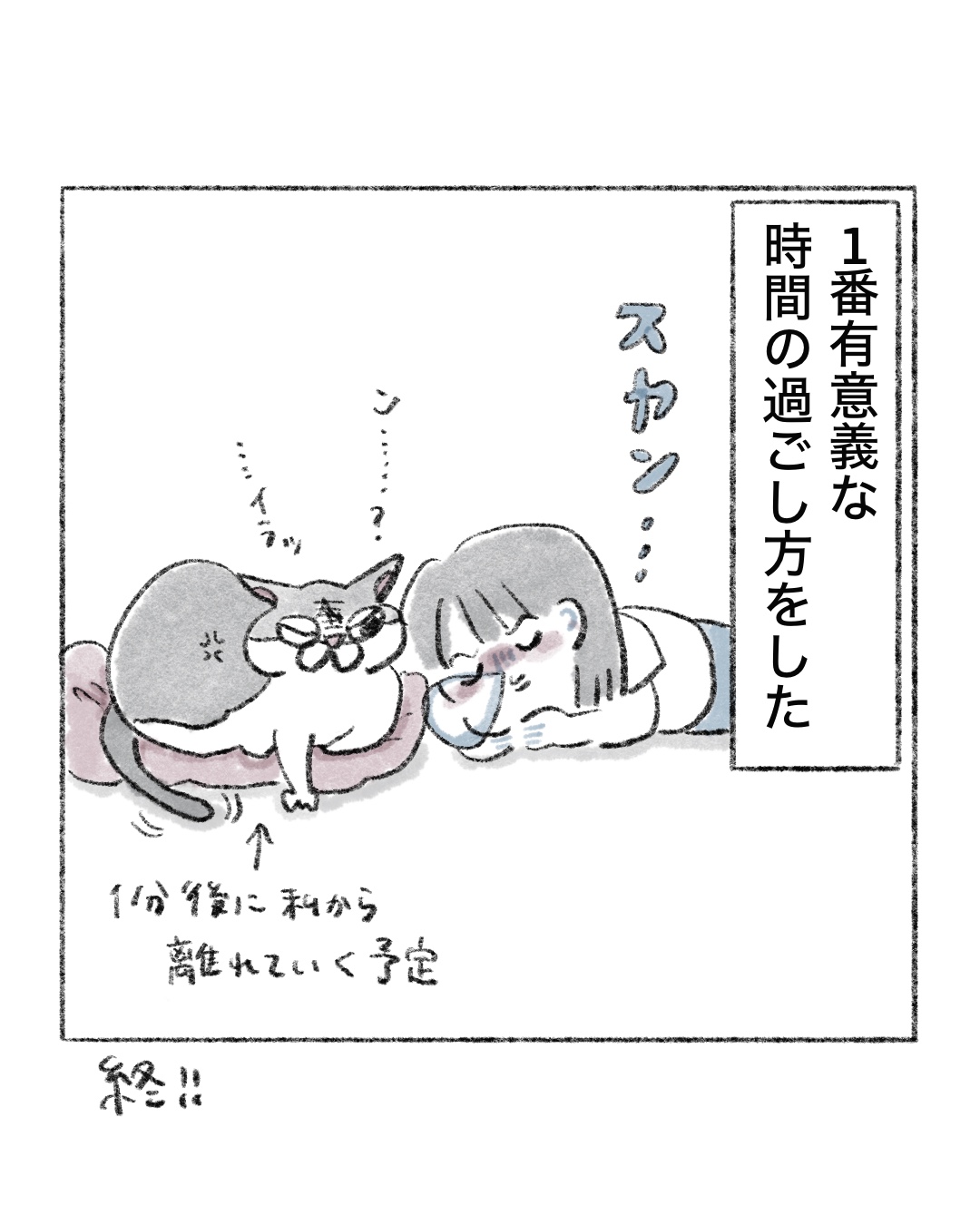 有意義な時間ってなによ 2026.03.04 エッセイ漫画 広告 137 コメントはこちら 同じカテゴリの記事 けんか仲裁ずぶ濡れおばけ 伊能忠敬界隈 バレリーナ志望 野良ボス猫のプレゼント 猫のギュイギュイという音 それでも食べる麻辣湯 からだの誇れるところ? 学ぶ、子猫キキ キキへ、本が出たよ 有意義な時間ってなによ まつパで最高の睡眠を..💤 ボス猫のおしっこ(やめて〜) 今ならウルセ〜!といえる キキと祖母 よもぎ蒸し体験③ よもぎ蒸し体験② よもぎ蒸し体験 夜中の猫 酸素は大事というコト!! 野良猫の中のボス猫 ゴキ🪳のトラウマが深すぎる 小麦と私🍝 母にバレたくない猫 猫飼いは猫じゃらしのプロになる 早食いになりたい 銭湯でぶっ倒れた♨️後 顎の猫 猫カフェに癒しを求めて… 麻辣湯カップ麺🍜 隠れる猫 背中にきびの治し方🏥 キキにキレられないやり方 麻辣湯が止まらない👿🍜 猫のおしゃべり🗣️🐈 麻辣湯初挑戦🍜 脇の注射と学ばない女2 脇の注射と学ばない女 母と爪切りと猫 ハイからのキレ 猫は気まぐれ(当たり前に) 髪の毛切りました 隠れる猫 誤解される飼い主(ツラい) 深く眠りたい(切実に) あったかい布、沼 何だその顔 寝ぼける猫 絶対に手は上 野良猫の楽園 脱毛のお姉さん2 脱毛のお姉さん 冬に埋もりがち猫 うさぎはモッモッと鳴きます それでも買ってしまう 理想のまつ毛 は難しい ラッコさんと漫画のネタ 冬の猫、たぬき それでも一緒に寝てみたい 錠剤怖い ご飯によって差が激しい猫 Gもハクビシンもイヤだ 猫まめ知識💡 猫の妖怪 猫又 誤字をキミは見つけられるか トイレする猫 見ちゃう 猫 耳隠し 猫の名前アレンジ 猫の折りたたまれた足 動物の本能 せっかく用意したのに 猫 中年というよりシニア猫 攻撃する猫 コタツの番人(猫) 猫とうさぎ 仲良くね〜 尻尾と出会う猫 暗闇忍者猫🥷 爪切る猫 冬の静電気猫 2 冬の醍醐味 猫 ご飯食べなくなる猫 ガガンボと猫 猫にまばたき 袋を猫と見間違えるのはあるある 落とす猫(あるある) 猫液体の作り方 液体猫 ヤバい奴と猫 年末の猫 風呂場の当たり屋 ショックを受ける猫 執念つよつよ猫 スマホ立てにされる猫 腕を出す 猫 お風呂場に猫 チャチャチャ 猫 抗えない 猫 AIで猫の擬人化を作る 毛布と猫 指しゃぶり猫 猫は気まぐれなのがいい 名前分かってる猫 冬の水セレブ猫 猫のご飯 結果 お弁当変化猫 先輩風吹かせ猫 寝ぼけている時寛容猫 カメムシと猫 目で叱ってくる猫 みんな好きだよね、猫の口 猫の毛を付けてゆくのだ 猫の毛玉ボール 冬と夏の猫 鬼ごっこの流れ 猫 (私的)猫の可愛い瞬間 水セレブ猫 猫のコメント欄 膝に乗るうさぎ 猫 よくくる質問 猫 いつもムスッとしてる猫 ふとした形の猫 あくび指猫 ファンサえぐい猫 シャーのニオイ猫 猫飼い主の発作 霊感があるのか猫 お尻トントン猫 猫缶は薄味のツナ缶 ニョー言わない猫 グルメな猫へ レーザーポインターはやめてね猫 お迎え初日の猫(かゆい)③ お迎え初日の猫(かゆい)② お迎え初日の猫(かゆい) 子猫でも変わらない猫 罠をかける猫 ごまかし猫 結局ウットリ猫 猫の皮膚の弛み 成長の猫 何がなんでも入る猫 臭いパトロール猫 不憫な姉と猫 部位別の反応、猫 猫 ブチギレ写真 猫の寿命 猫、オスメスの見分け方 優しくなった猫 母と猫 アンタのせいだよ、猫 ビックリしちゃう猫 しっぽ叩き猫 目を合わせない猫 遊び猫 逆ギレ猫 ほんとにサヨナラ、モフモフ 去勢猫 グッバイモフモフ 去勢猫 モフモフ 肉球猫 客人と猫 ダミ声猫 ご飯催促猫 こういうラッキーもある G嫌すぎ 猫用ケーキ🍰 パーソナルカラーと猫 筋肉質猫 🍣🍜りくさんの猫 吐く猫 おえおえ 猫とセミ 返事しすぎ猫 姉と猫(不憫) ダンボール好き猫 ウンチハイ猫 老いていく猫 夜中の猫 マタタビ猫 猫のゴロゴロ 慰め猫(あたたか) キキの心情 キキという名前 厚底サンダルマダム 猫ニキビ 激アツ美容院 猫あるある やらない 猫吸いチャレンジ 牛乳か雲丹か 街中膝カックン 話しかけるのもダメ パクパク女 水へのこだわり💦 飼い主のことを忘れた猫 お漏らし癖⑦終 お漏らし癖⑥ お漏らし癖⑤ お漏らし癖④ お漏らし癖③ お漏らし癖② お漏らし癖① 小学生彼女オーディション終 小学生彼女オーディション⑥ 小学生彼女オーディション⑤ 小学生彼女オーディション④ 小学生彼女オーディション③ 小学生彼女オーディション② 小学生彼女オーディション① 男子と喧嘩(終) 男子と喧嘩11 男子と喧嘩⑩ 男子と喧嘩⑨ 男子と喧嘩⑧ 男子と喧嘩⑦ 男子と喧嘩⑥ 男子と喧嘩⑤ 男子と喧嘩④ 男子と喧嘩③ 男子と喧嘩② 男子と喧嘩① 短いスカート履かせてあげたいョ‼️ 高校生の靴下の長さは…?🧦 初投稿 おしりぷりぷりブログかましたる 前の記事 まつパで最高の睡眠を..💤 2026.03.02 次の記事 キキへ、本が出たよ 2026.03.05 アプリなら通知ですぐ読める! NAPBIZブログ This site is protected by reCAPTCHA and the Google Privacy Policy and Terms of Service apply.